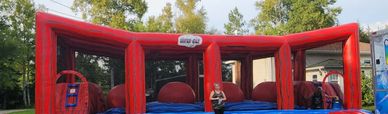 The Radical Run Obstacle course can be rented as a full course, or as a mini obstacle/slide combo! Send 2 racers head to head, where they'll run through the mini course, up the rock wall and down the slide, then plow through obstacles in a race to the finish